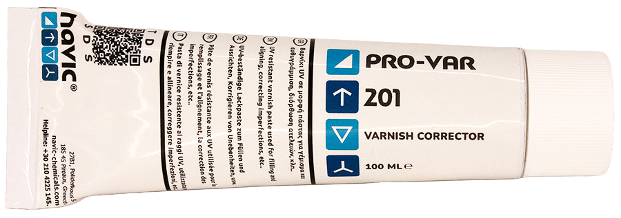 PRO-VAR 201 is a one component, solvent based, UV resistant, gloss varnish in paste form, which is applied using a batten or filling knife. Used to fill defects and imperfections and to re-align previously varnished surfaces in order to produce a smooth finish.